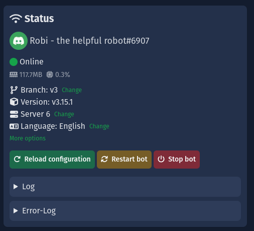 - Klicke auf "Mehr Optionen" in dem "Status"-Panel von deinem Bot.