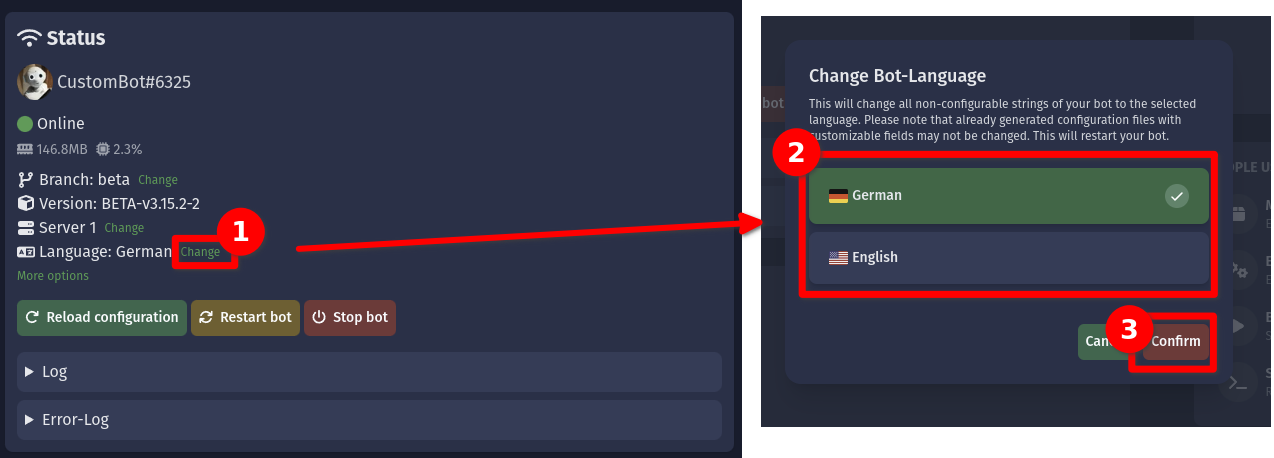 - "Bot neustarten": Dies wird den Prozess deines Bots neustarten. Dies wird eventuell einige Minuten in Anspruch nehmen, zusätzlich wird der Bot für eine kurze Zeit offline sein, in welcher der Bot nicht erreichbar sein wird. Du solltest deinen Bot nur neustarten, wenn du dazu aufgefordert wirst, seltsame Fehler auftreten oder du ein Update durchführen willst.