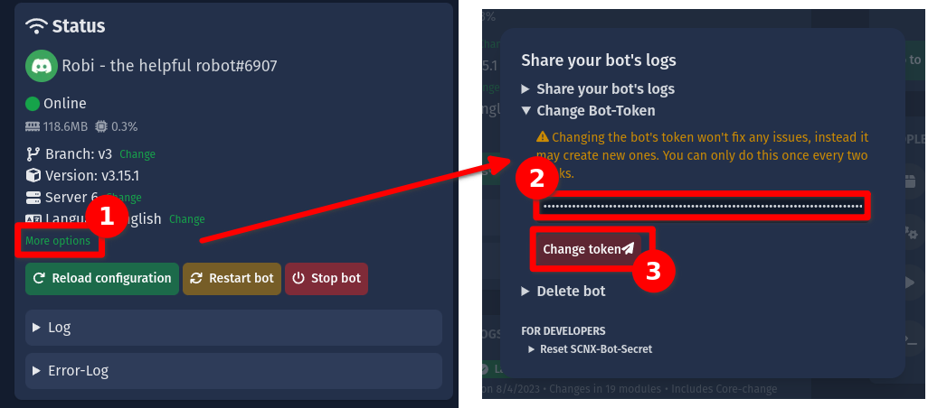 - Füge deinen neuen Bot-Token ein und bestätige die Änderung, indem du auf "Token ändern" klickst.