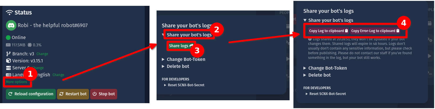 - Klicke auf "Teile deine Bot-Logs" und danach auf "Logs teilen". Dein Bot-Host wird nun die Logs auf paste.scootkit.net hochladen, dies kann ein paar Sekunden dauern.