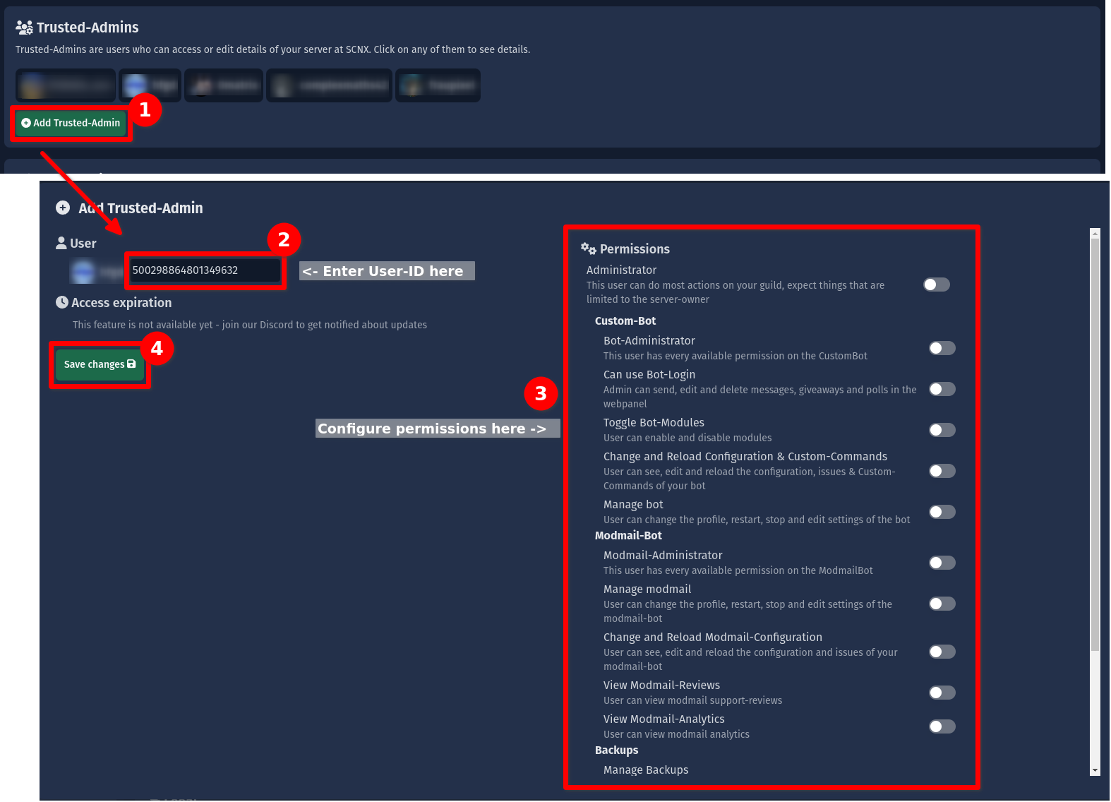- andere Trusted Admins deines Servers hinzufügen, ihre Berechtigungen ändern oder entfernen - Nur der Server-Eigentümer und Co-Owner können dies.