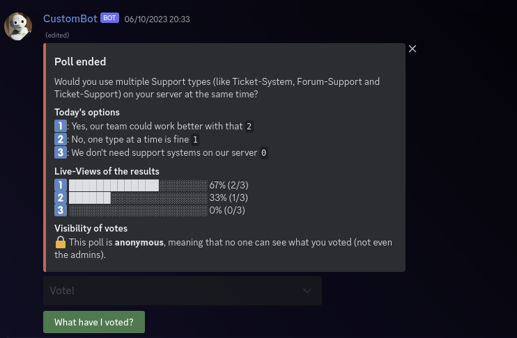 - view what they voted for using the "What have I voted?" button below the poll.